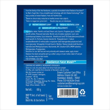 From the Family of Fair And Handsome, a specially formulated Instant Radiance Face Wash for Men's Tough Skin. It has a breakthrough Acti-Radiant technology, that helps provide an Instant Radiant, Fresh and Youthful look. Pack of 1 Brand FAIR AND HANDSOME Model Name Instant Radiance Face Wash 100 gm Quantity 100 g Ideal For Men Face Wash Type Gel Ingredient Type Synthetic Maximum Shelf Life 24 Months Applied For Radiance & Glow Skin Type All Skin Types Container Type Tube Other Traits How to Apply: Wet face and neck preferably with lukewarm water; apply Instant Radiance Facewash and gently work up a lather using a circular motion. Wash off and pat dry. Use twice for better results.