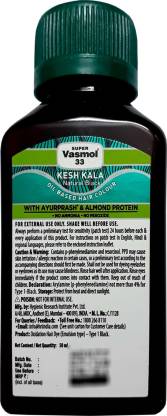 Super Vasmol 33 Kesh Kala Oil Based Hair Colour With Ayurprash And Almond Protein: Net Weight - 50ml, Product Description: Super Vasmol 33 Kesh Kala is an oil based formulation that is easy and convenient to use. It is enriched with the goodness of Ayurprash and Almond Protein and is free from harsh chemicals such as Ammonia and Peroxide. Super Vasmol 33 Kesh Kala works on a natural oxidation process that is it uses oxygen from the air to colour hair, resulting in natural looking, beautiful, and black hair. *Used for: Hair Colour, *Gender: Men and Women, *Hair Type: All hair type. Pack of 1 Sales Package 1 Hair Colour General Brand Super Vasmol Model Name 33 Kesh Kala Oil Based Hair Colour 50ml Quantity 50 ml Brand Color Black Ammonia Free Yes Ideal For Men & Women Color Black Container Type Bottle Organic Yes Maximum Shelf Life 36 Months Instruction Added Other Features Vasmol 33 Kesh Kala works on a natural oxidation process that is it uses oxygen from the air to colour hair, resulting in natural looking, beautiful, and black hair. Dimensions Width 11 cm Height 5 cm Depth 3.5 cm Weight 100ML